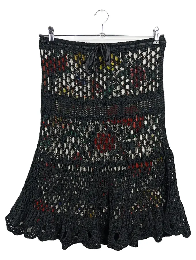 A-Linienrock Damen Gr. 40/L Schwarz Lochmuster Baumwolle Leinen