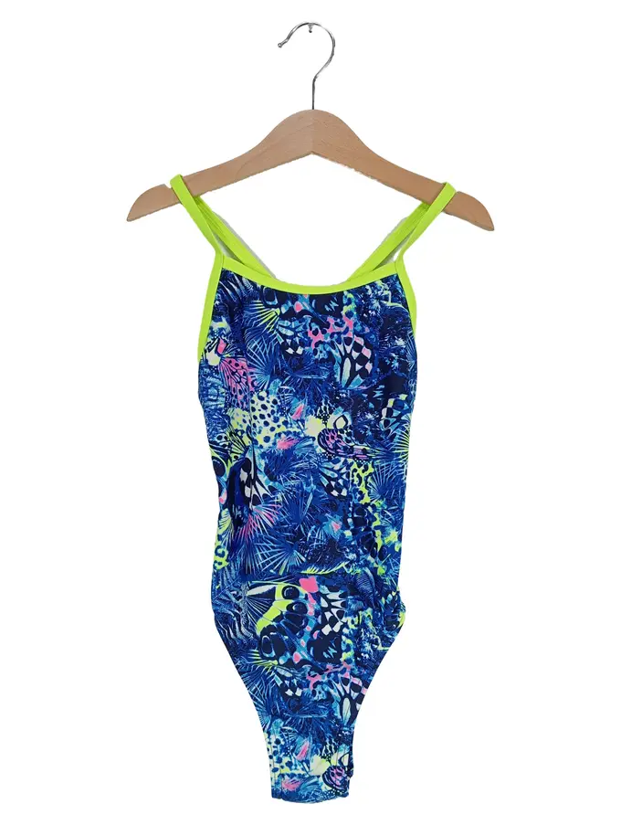 Badeanzug Mädchen Gr. 134 Blau Neongelb Tropical Print Sport