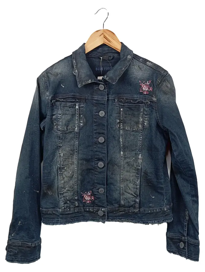 BLUE FIRE CO. Damen Jeansjacke Gr. 42 Dunkelblau Stickerei Vintage Denim Jacke