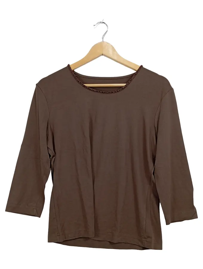 Bluse Damen 3/4-Arm Elegant Braun Perlen Gr. L Baumwolle