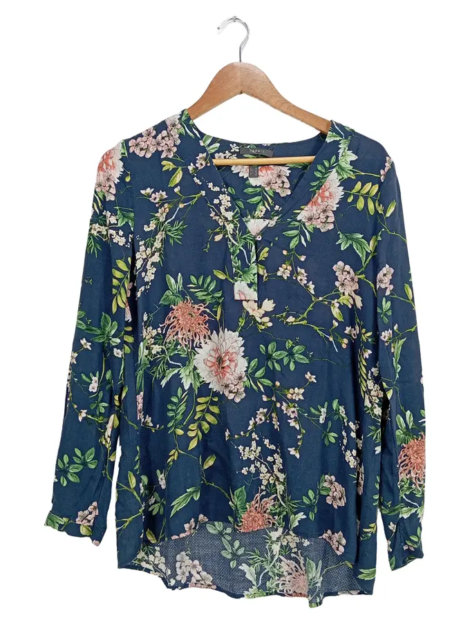 Bluse Damen Gr. 38/M Blau Blumenmuster Viskose Langarm