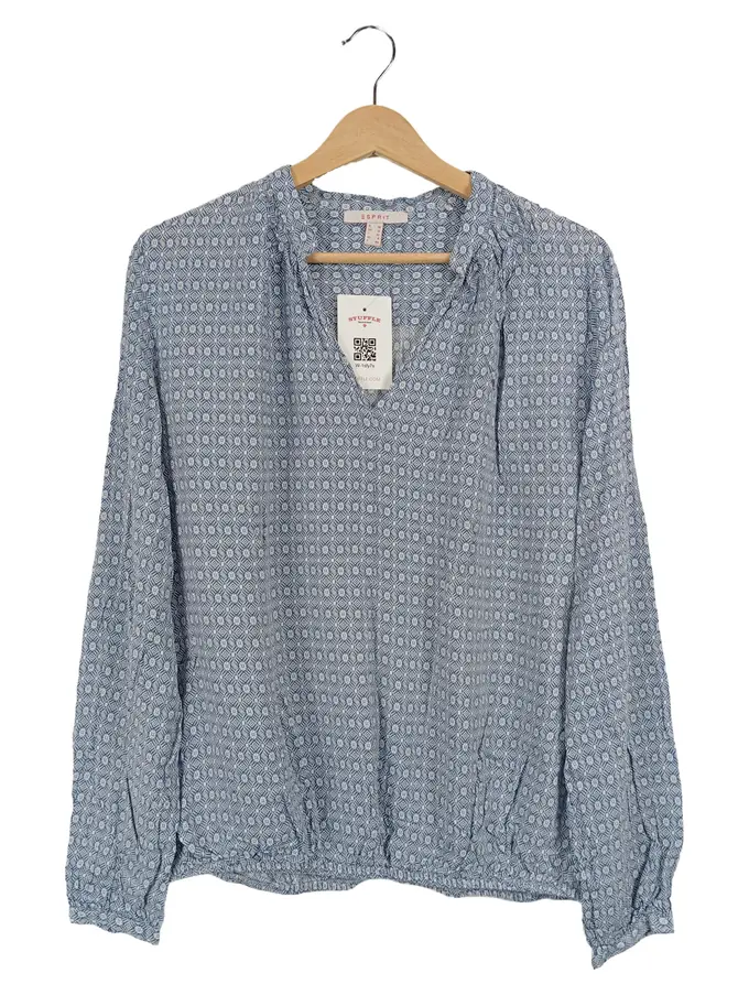 Bluse Damen Gr. 38 M Blau Grafisch Langarm Viskose Casual Rüschen