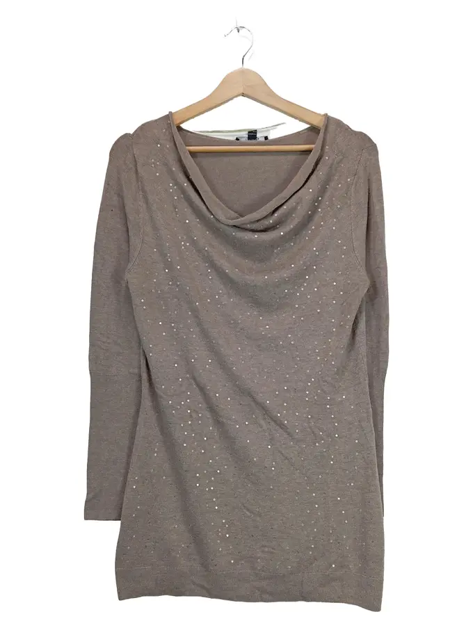 Comma Pullover Damen 38 M Beige Pailletten Wasserfallkragen Elegant Viskose