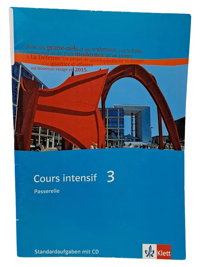 Cours intensif 3 Passerelle ist ein Französisch-Lehrwerk für den intensiven Sprachunterricht. Das Buch enthält Standardaufgaben mit begleitender CD und richtet sich an fortgeschrittene Französischlernende. Thematisch wird unter anderem La Défense, das moderne Geschäftsviertel von Paris mit seiner zeitgenössischen Architektur und Kunst, behandelt. Das Lehrwerk eignet sich für Schüler, die ihre Französischkenntnisse vertiefen möchten.