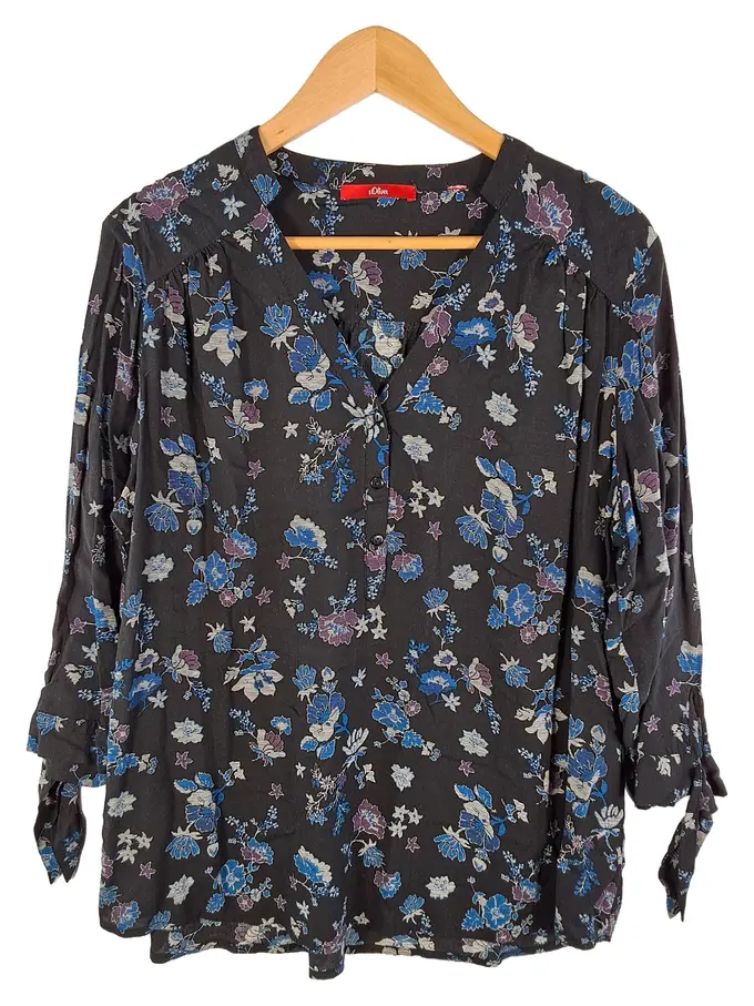 Damen Bluse 3/4-Arm Blumenmuster Schleife Schwarz L