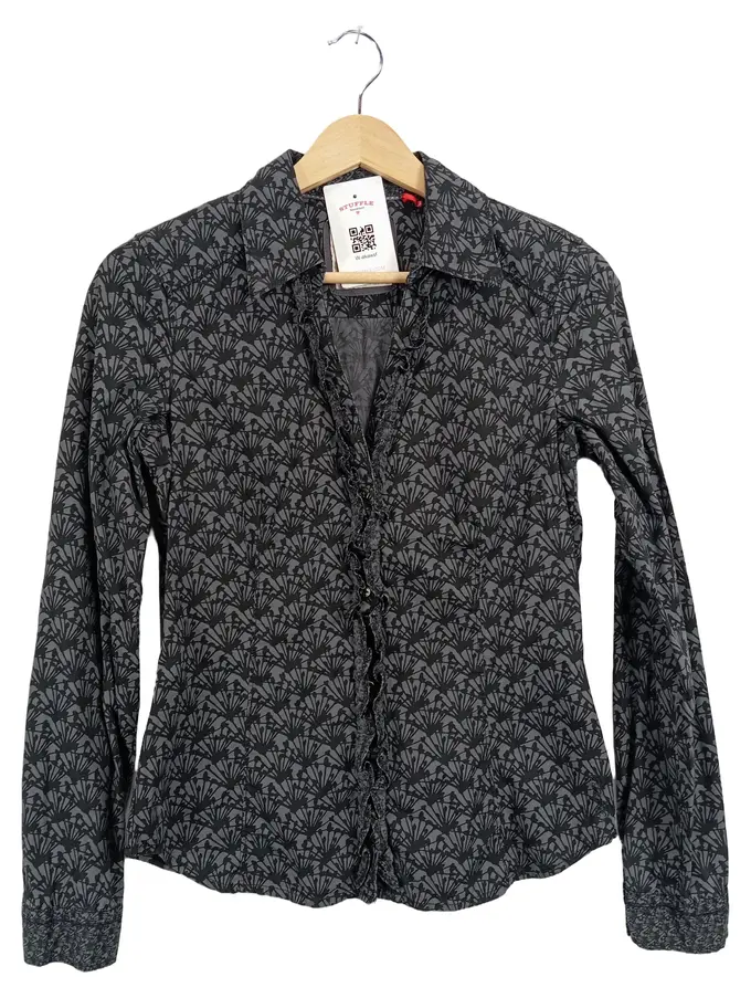 Damen Bluse Gr. 34/XS Grau Floral Rüschen Langarm Baumwolle