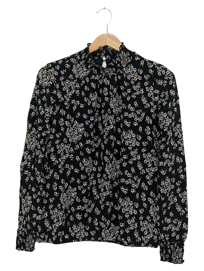Damen Bluse Gr. 34/XS Schwarz Florales Muster Langarm Rüschen