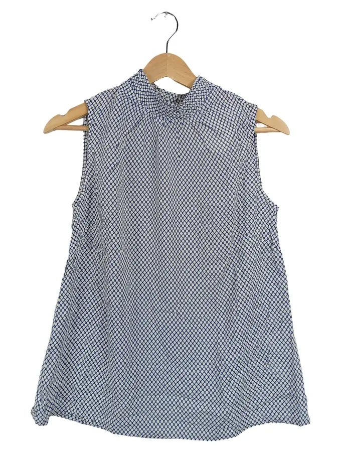 Damen Bluse Gr. 36 Blau Weiß Geometrisch Ärmellos Viskose