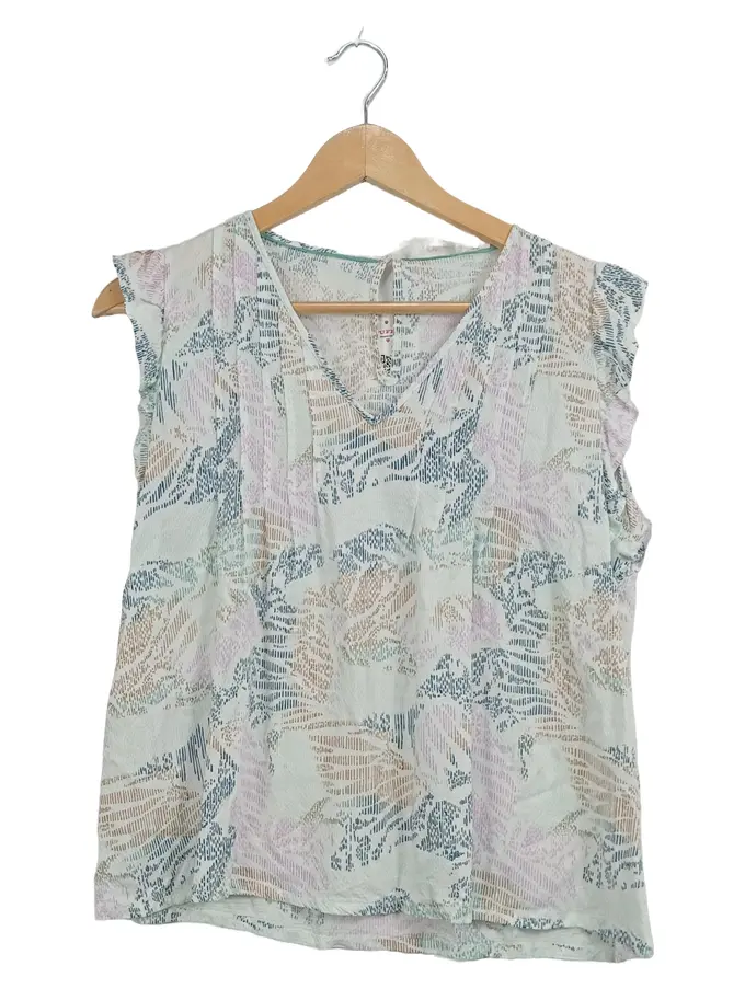 Damen Bluse Gr. 36 S ärmellos Rüschen Muster Viskose