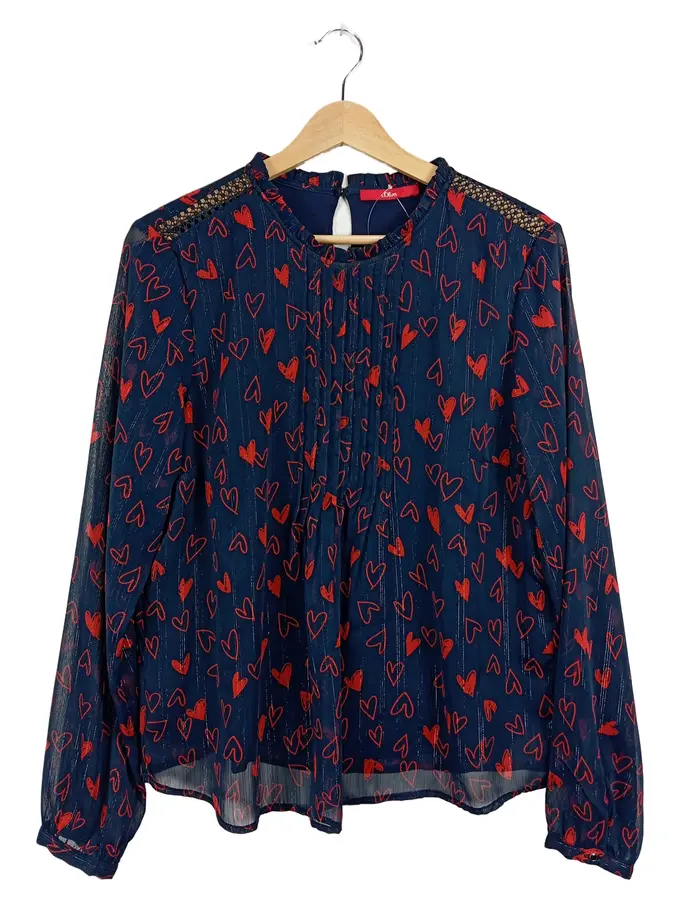 Damen Bluse Gr. 38 Blau Herzmuster Spitze Langarm Romantisch