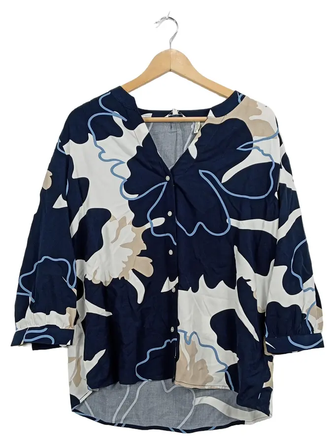 Damen Bluse Gr. 38 Blau Weiß Floral V-Ausschnitt 3/4-Arm