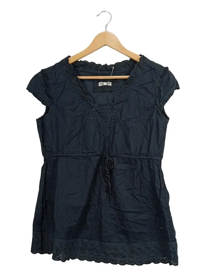 Damen Bluse Gr. 38 Schwarz Baumwolle Spitze Lochstickerei