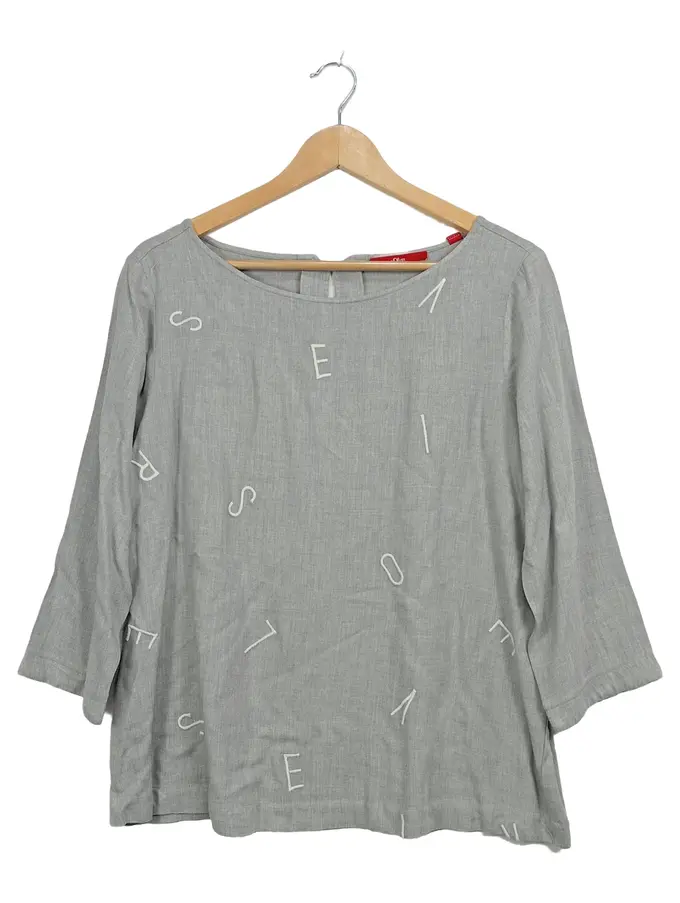 Damen Bluse Gr. 40/L Grau Leinen Buchstaben Stickerei 3/4-Arm