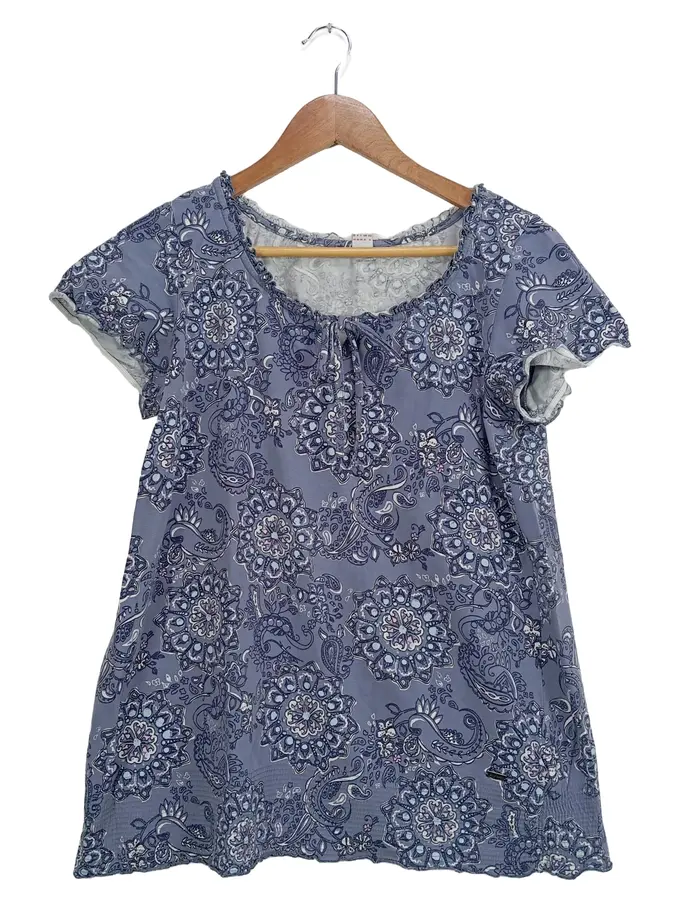 Damen Bluse Gr. 44 Blau Florales Muster Casual Kurzarm
