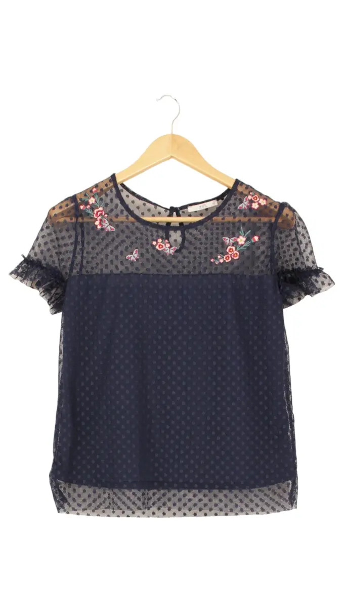 Damen Bluse Gr. XS/32 Blau gepunktet mit Blumenstickerei Elegant