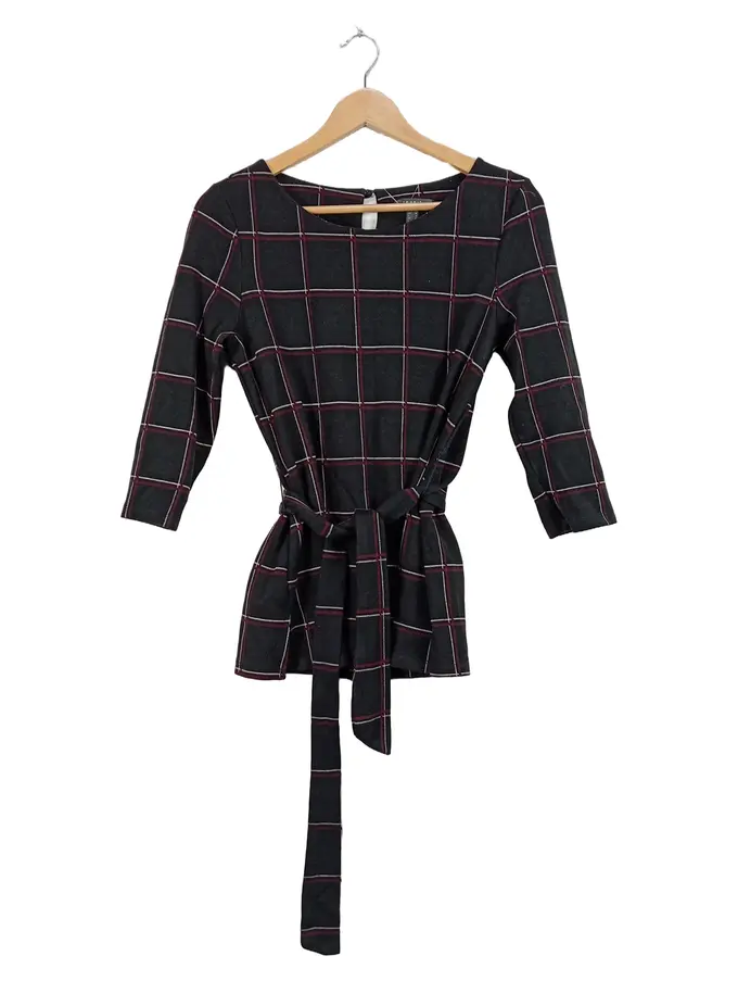 Damen Bluse Kariert mit Bindegürtel Gr. M Schwarz Elegant