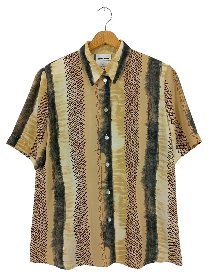 Damen Bluse Vintage Grafik Muster Beige Kurzarm Gr. 40/M