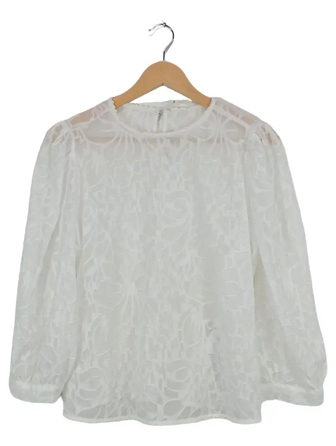 Damen Bluse Weiß Strukturmuster Langarm Spitze Gr. 40 L Alltag