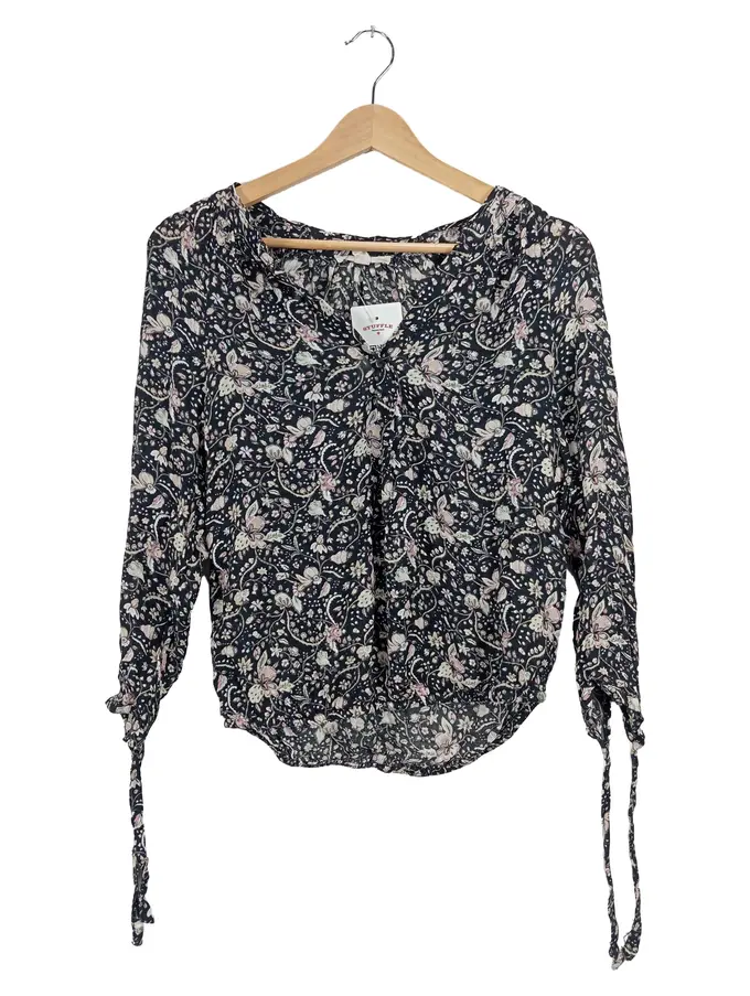Damen Bluse XS Langarm Blumenmuster Schwarz Boho Viskose