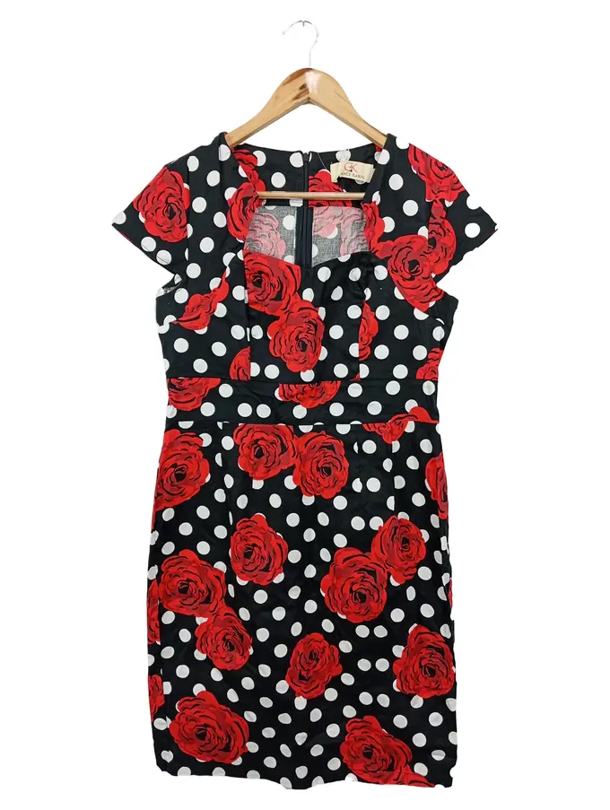 Damen festliches Kleid 40/L Schwarz Rot Weiß Punkte Blumen Elegant