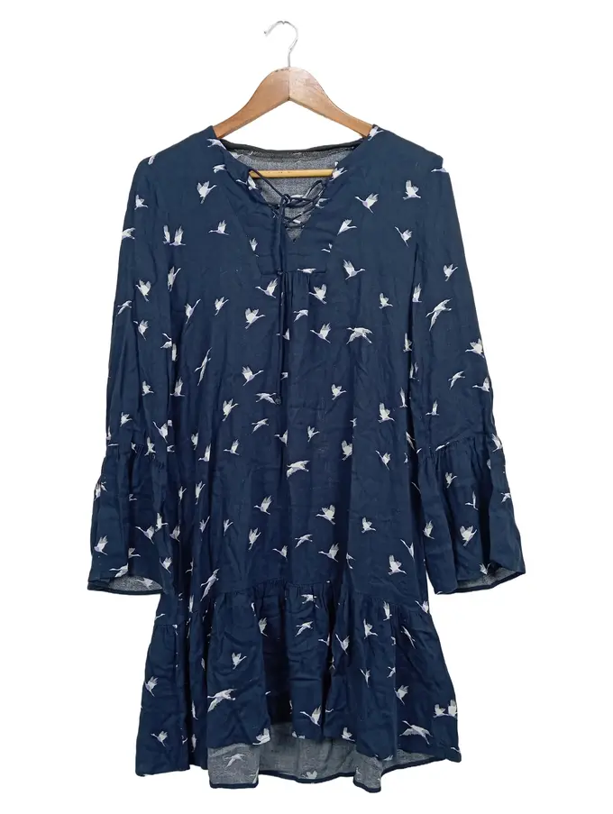 Damen Freizeitkleid Gr. 36 S Blau Vogelmuster Rüschen Casual