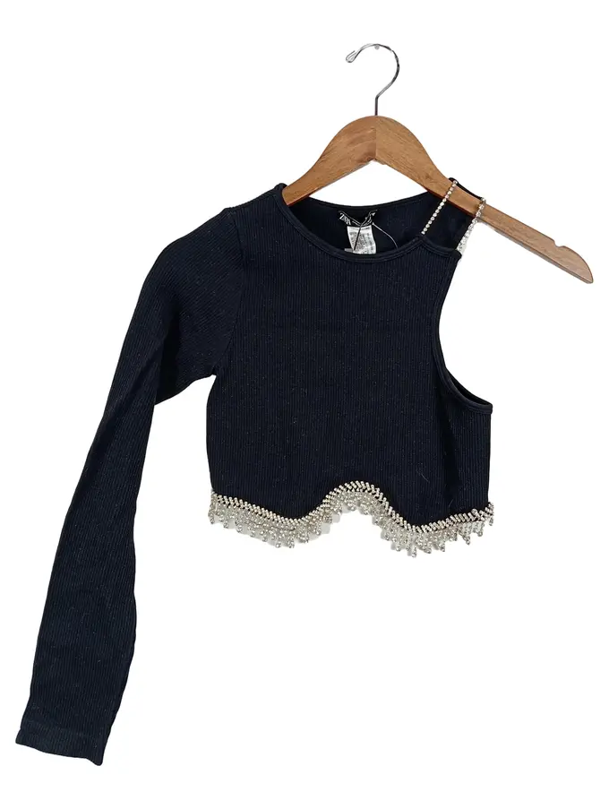Damen Glamourös Rippstrick Crop Top Langarm Strass Schwarz L