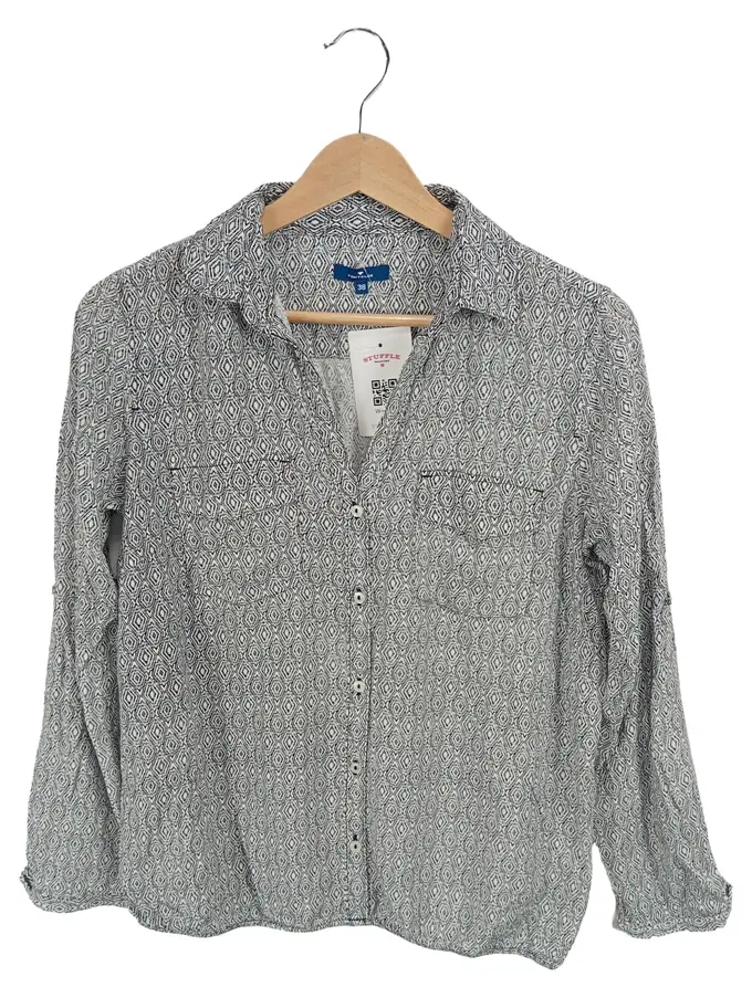 Damen Hemdbluse Gr. 38 M Grau Geometrisch Muster Langarm