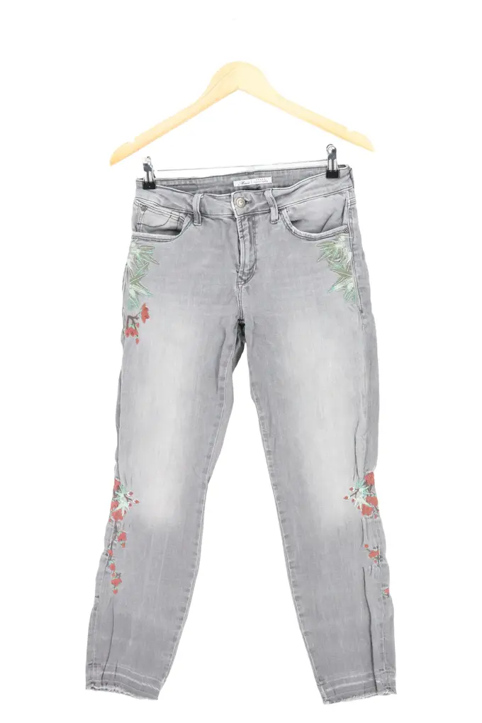Damen Jeans Slim Fit W28/36/S Grau mit Blumen Stickerei