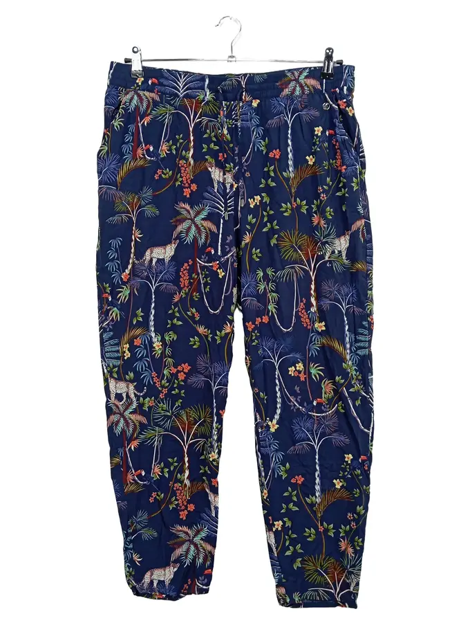 Damen Jogginghose Gr. 44 Blau Viskose Tropisches Muster Casual