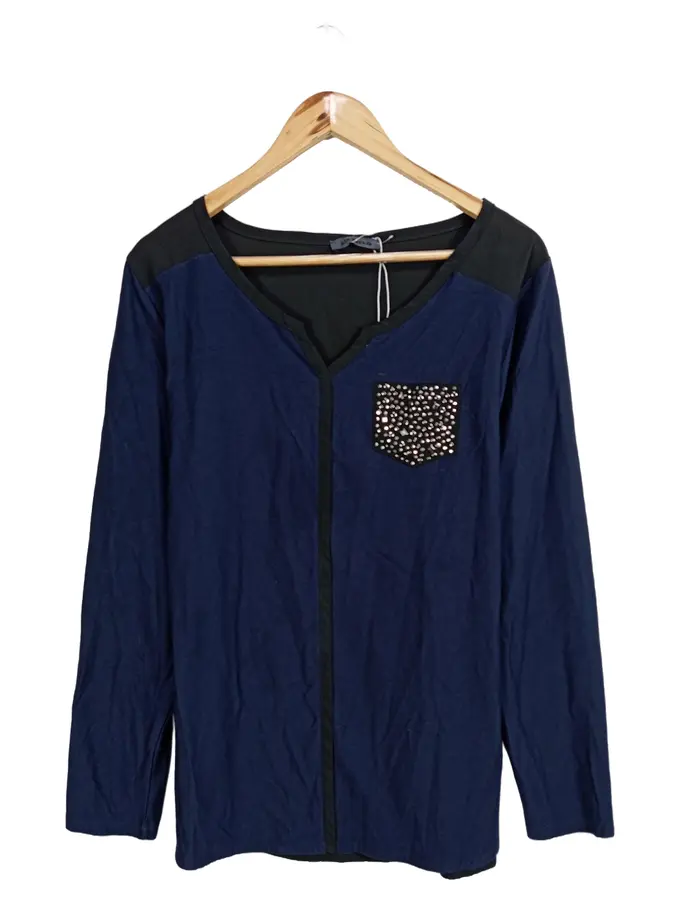 Damen Langarmshirt Gr. 46 Blau Schwarz Strass Tasche Elegant