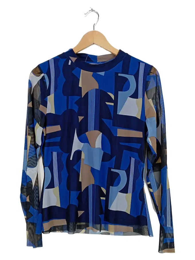 Damen Langarmshirt Mesh Abstraktes Muster Gr. 38 Blau