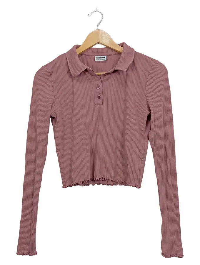 Damen Langarmshirt Polokragen Rippstrick Rosa Cropped Gr. S