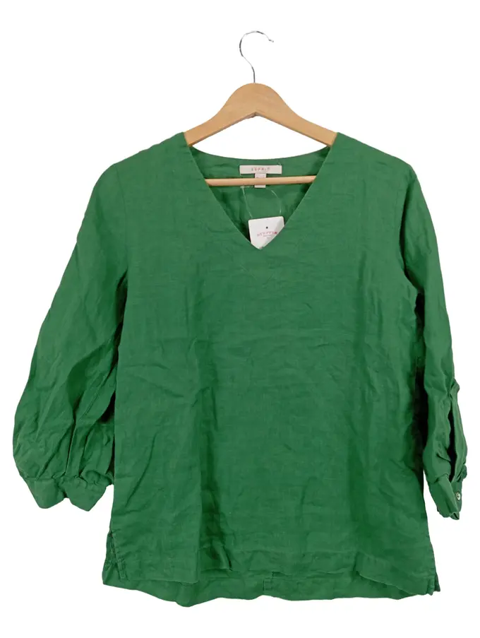 Damen Leinen Bluse Gr. 36 S Grün 3/4-Arm V-Ausschnitt