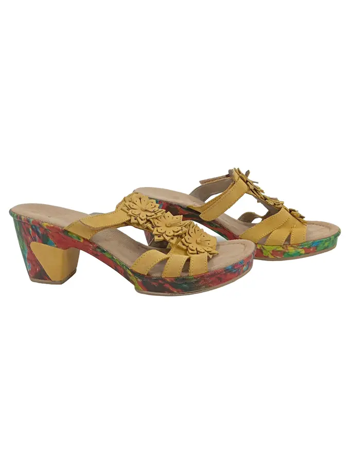 Damen Pantoletten Gr. 39 Gelb Blumen Blockabsatz Bohemian