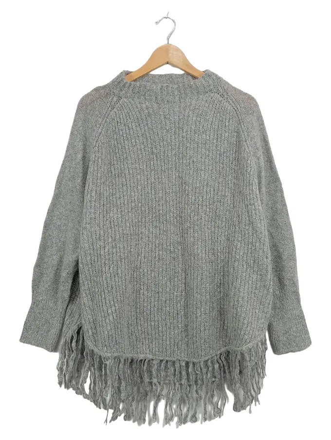 Damen Poncho Gr. S Grau Fransen Mohair Mix Strick Bohemian