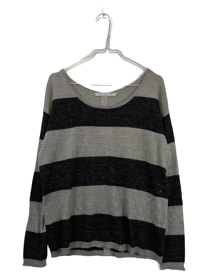 Damen Pullover Gr. 38 M Grau Schwarz Gestreift Wolle Leinen Knopfleiste