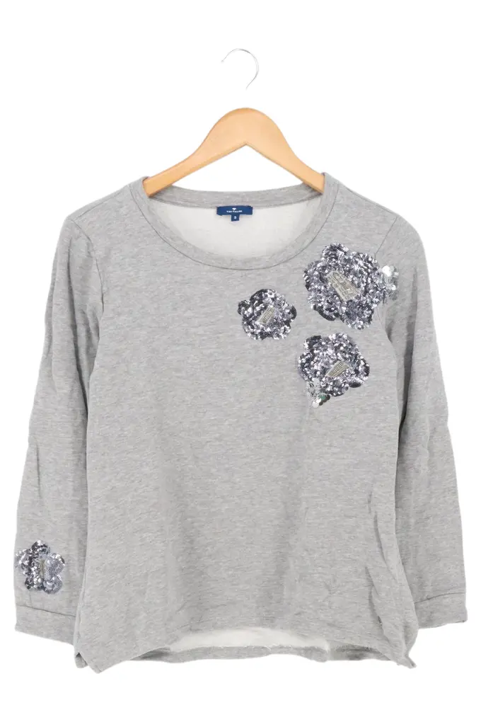 Damen Pullover Grau Pailletten Blumen Gr. 36/S Casual 3/4-Arm