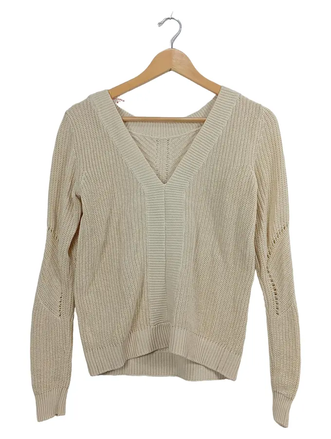 Damen Pullover Strickpullover Gr. 36/S Beige V-Ausschnitt Lochmuster
