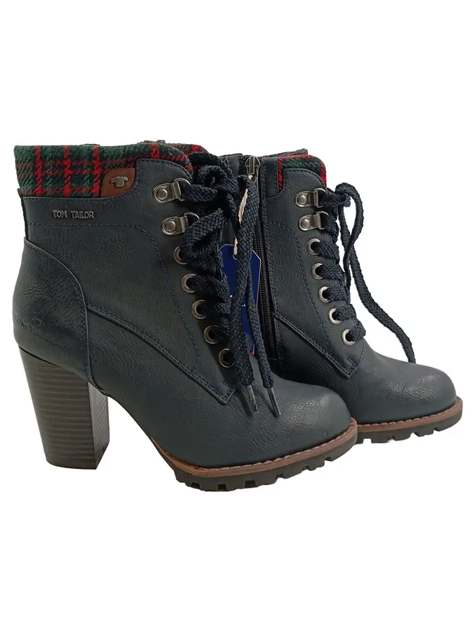 Damen Schnürstiefelette Blockabsatz Kariert Blau Gr. 37