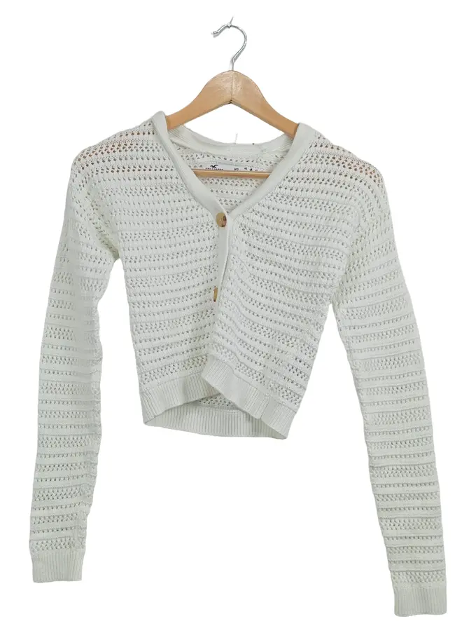 Damen Strickjacke Cropped Lochmuster Weiß Gr. XS