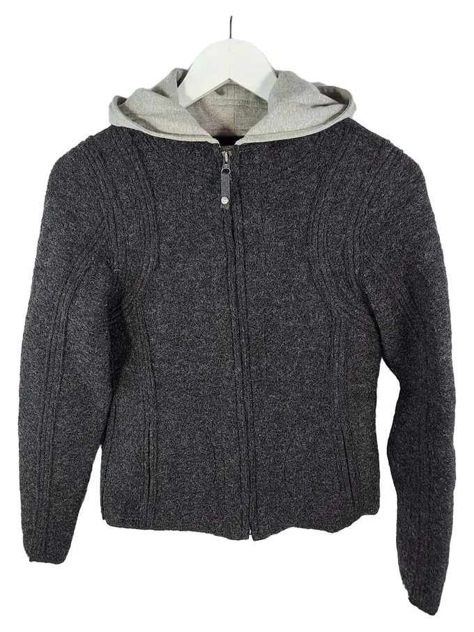 Damen Strickjacke Gr. 34/XS Grau Meliert Kapuze Wolle Reißverschluss