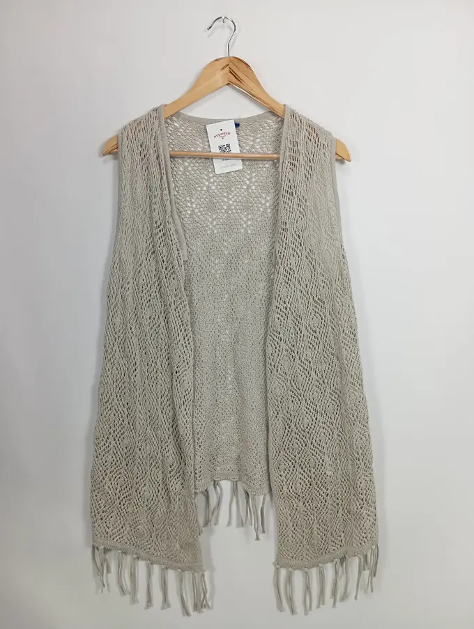 Damen Strickjacke L/40 Grau Lochmuster Fransen Baumwolle Polyacryl