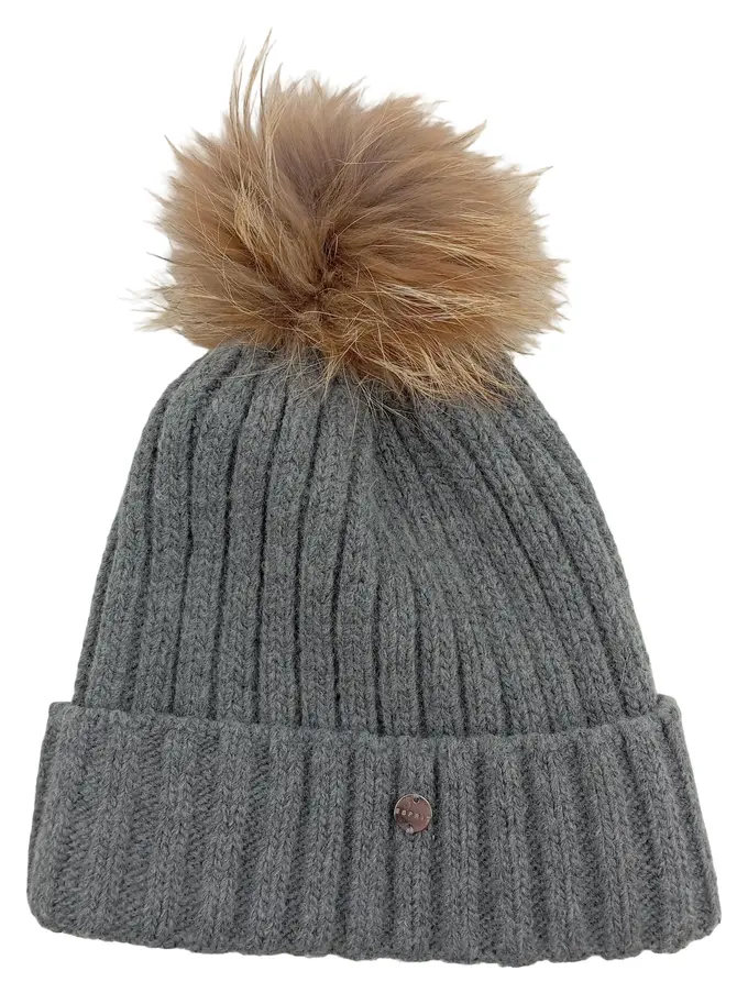 Damen Strickmütze Grau Bommel Fellpompon Wolle Acryl Rippstrick