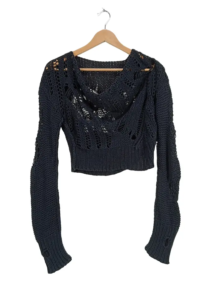 Damen Strickpullover Gr. 36/S Schwarz Lochmuster Cropped