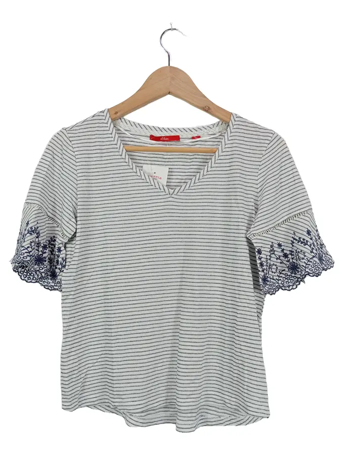 Damen T-Shirt Gr. 34 XS gestreift mit Stickerei weiß