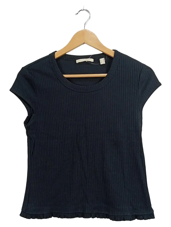 Damen T-Shirt Gr. 38/M Schwarz Rippstrick Rüschen Kurzarm