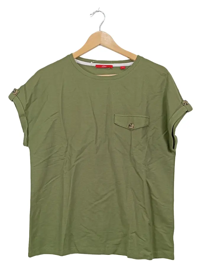 Damen T-Shirt Gr. 38 Oliv Brusttasche Zierknöpfe Casual