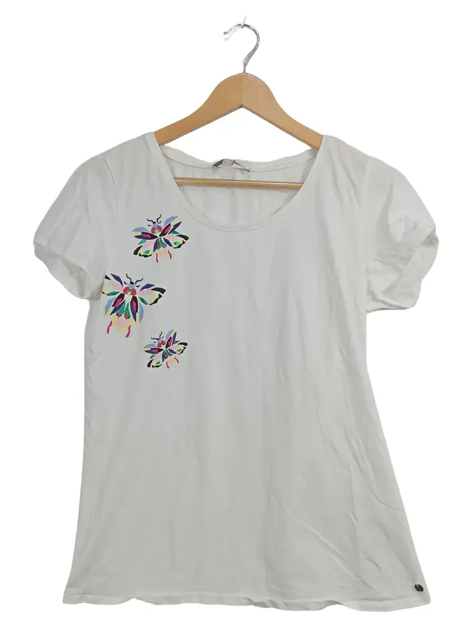 Damen T-Shirt Gr. 40/L Weiß Kurzarm Baumwolle Tiermotiv Glitzer