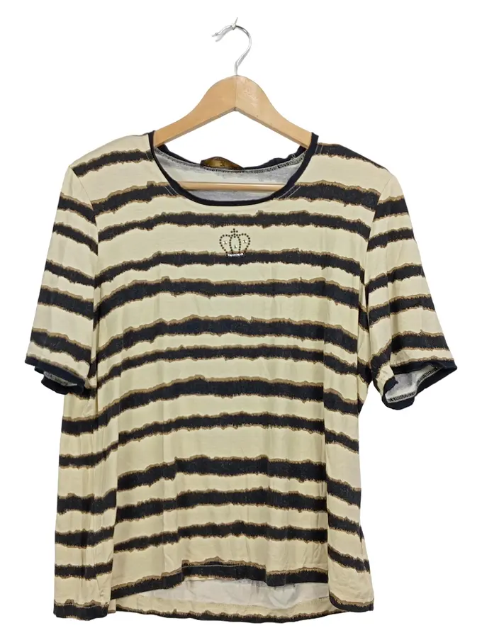 Damen T-Shirt Gr. 44 Gestreift Krone Strass Beige Schwarz