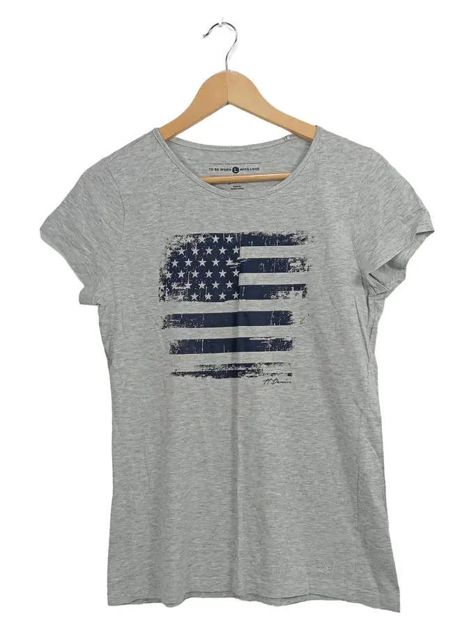 Damen T-Shirt Grau L USA Flagge Motiv Kurzarm Casual